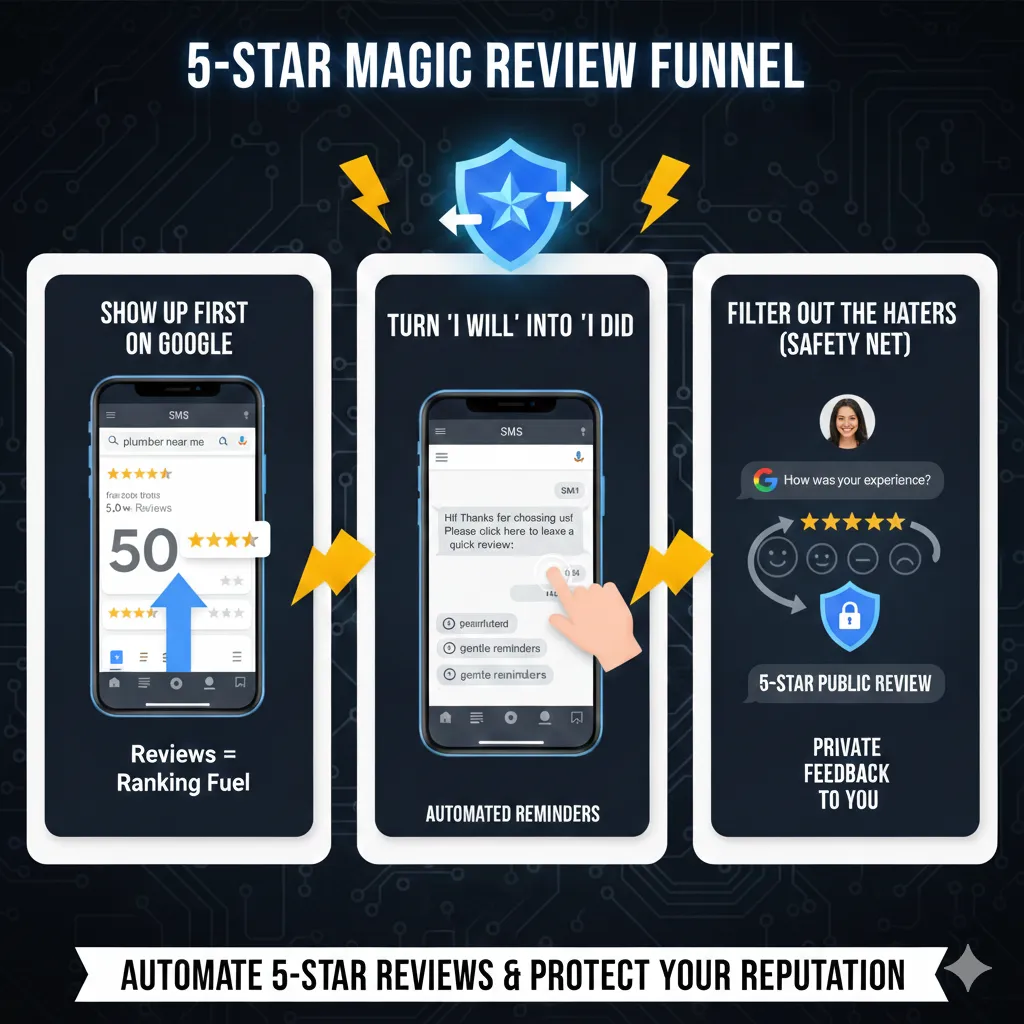 Show Up First On Google: Google trusts the business with the most 5-star reviews. We help you stack them up faster than your competition, proving you are the #1 choice in town.